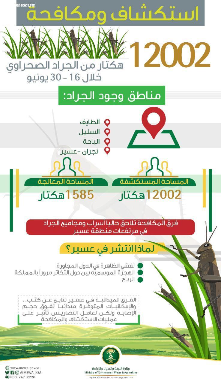 وأوضحت الوزارة أنه تم استكشاف 12002 هكتار خلال النصف الثاني من يونيو الماضي، بينما تمت معالجة 1585 هكتار في كلٍّ من محافظة الطائف، ومناطق الرياض والباحة ونجران. مؤكدة أن وضع الجراد الصحراوي في تلك المناطق تحسن ولله الحمد، وأن عمليات الاستكشاف والمكافحة مستمرة حتى إعلان التطهير وانقضاء الإصابة تماماً.