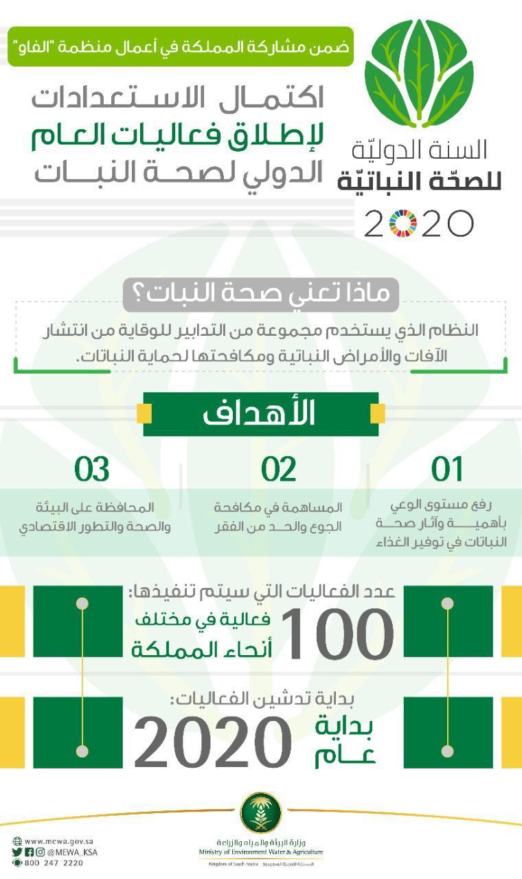 وبين الغامدي أن تدشين الفعاليات سيكون بداية عام2020، والتي تشمل تنظيم ورش عمل إقليمية، وندوات محلية للتوعية بالصحة النباتية، وحملات علاقات عامة واعلامية، وجوائز للمزارعين الممارسين للأعمال الوقائية للصحة النباتية.