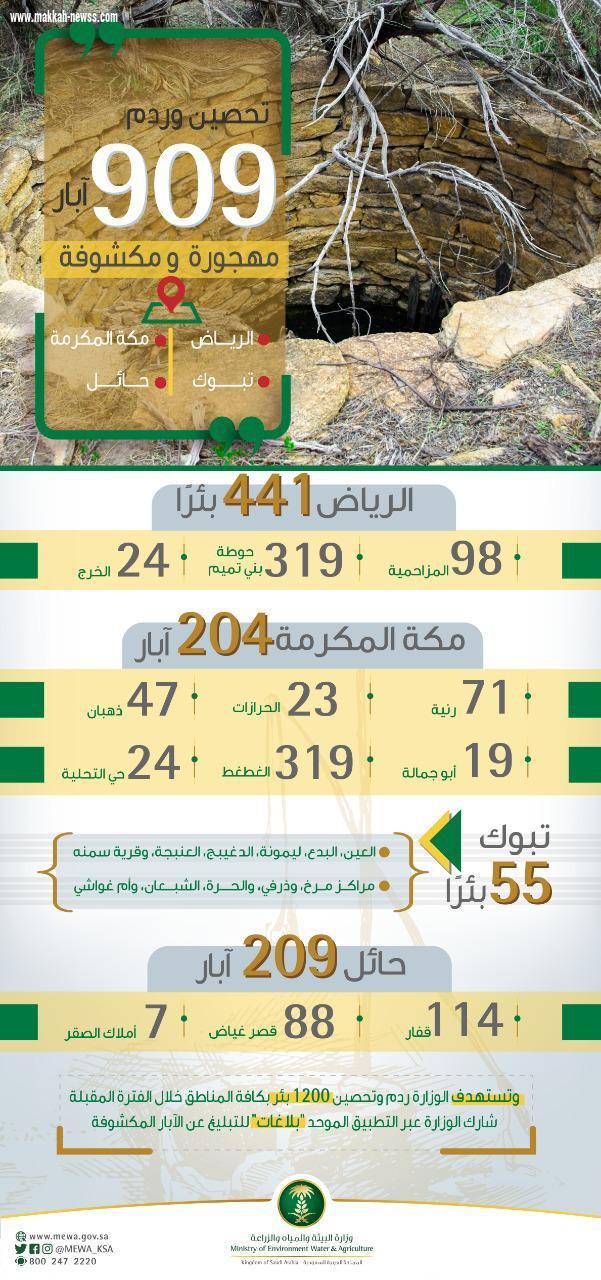 كشفت وزارة البيئة والمياه والزراعة عن تحصينها وردمها لعدد 909 بئرًا مهجورًا في مناطق الرياض، ومكة المكرمة، وتبوك، وحائل، بالتنسيق مع اللجان المشتركة في الجهات ذات العلاقة، وذلك للحفاظ على سلامة الأرواح والممتلكات، والحد من تلوث طبقات المياه الجوفية.