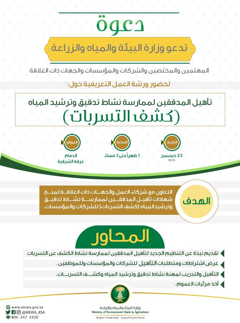 البيئة والمياه والزراعة، ورشة عمل تعريفية حول التنظيم الجديد لتأهيل المدققين لممارسة نشاط تدقيق وترشيد المياه (كشف التسربات)، يوم الإثنين بتاريخ 23 ديسمبر 2019 في غرفة الشرقية بالدمام، وذلك تمهيداً لمنح شهادات تأهيل المدققين للشركات والمؤسسات، بالتعاون مع شركاء العمل والجهات ذات العلاقة. وتأتي هذه الورشة، ضمن جهود المرحلة الثانية من برنامج تأهيل المنشآت لممارسة نشاط تدقيق وترشيد استهلاك المياه (كشف التسربات) في المباني. ودعت الوزارة، المهتمين والمختصين والشركات والمؤسسات والجهات ذات العلاقة لحضور ورشة العمل والمشاركة وتقديم المرئيات في اشتراطات ومتطلبات التأهيل للشركات والمؤسسات، وكذلك اشتراطات ومتطلبات الفنيين العاملين في نشاط تدقيق المياه. وكانت وزارة البيئة والمياه والزراعة، قد وضعت معايير جديدة لممارسة نشاط تدقيق وترشيد المياه (كشف التسربات) شملت، معرفة الأساسيات، والتدقيق الفني المتعلق بالمياه، وتوفر المعدات والأدوات اللازمة، والخبرة العملية، والصحة والسلامة المهنية، وخدمة العملاء، وتوفر المركبات، والالتزام بالزي الموحد وغيرها من متطلبات العمل، بالإضافة إلى ضرورة تحقيق الشركات والمؤسسات أكثر من 60 في المائة من هذه المعايير للحصول على التأهيل اللازم، وستنشر قائمة دورية بالشركات والمؤسسة المعتمدة والمؤهلة لممارسة هذا النشاط للجمهور، مع مواصلة تقييم الأداء المستمر للشركات والمؤسسة المؤهلة في هذا المجال.