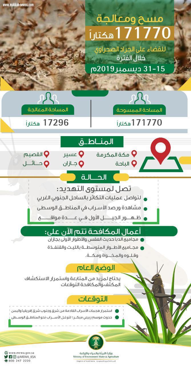 كشفت وزارة البيئة والمياه والزراعة أن فرق الاستكشاف والمكافحة التابعة لها قامت خلال النصف الثاني من ديسمبر الماضي بمسح 171770 هكتارًا، ومعالجة 17296 هكتارًا في الليث والقنفذة بمكة المكرمة، وقلوه والمخواة في الباحة، ومركز سعيدة الصوالحة والحريضة التابعة لمنطقة عسير، وفي أحد المسارحة وبيش والشقيق وأبو عريش وصبيا بجازان، وبعض المحافظات بالرياض والقصيم وحائل.