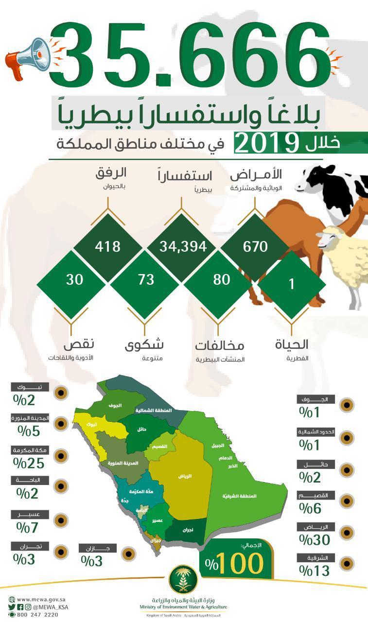 استقبلت وزارة البيئة والمياه والزراعة، 35,666 بلاغاً واستفساراً من مختلف مناطق المملكة خلال العام الماضي 2019م، شملت 34,394 استفساراً طبياً حول الأمراض البيطرية، ونحو 1272 بلاغاً وشكوى متنوعة، بالإضافة إلى استخراج نحو 106 تصاريح نقل الدواجن وخطوط السير.