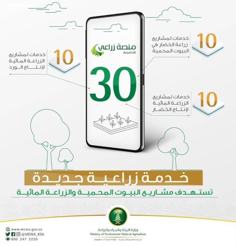 أطلقت وزارة البيئة والمياه والزراعة، 30 خدمة إلكترونية جديدة عبر منصة "زراعي"، لمشاريع البيوت المحمية والزراعة المائية، وذلك في إطار سعي الوزارة للتحول الرقمي في أعمالها، والمساهمة في رفع كفاءة العمل، وتسهيل طلب الخدمات، وتوفير الوقت والجهد للمستفيدين.