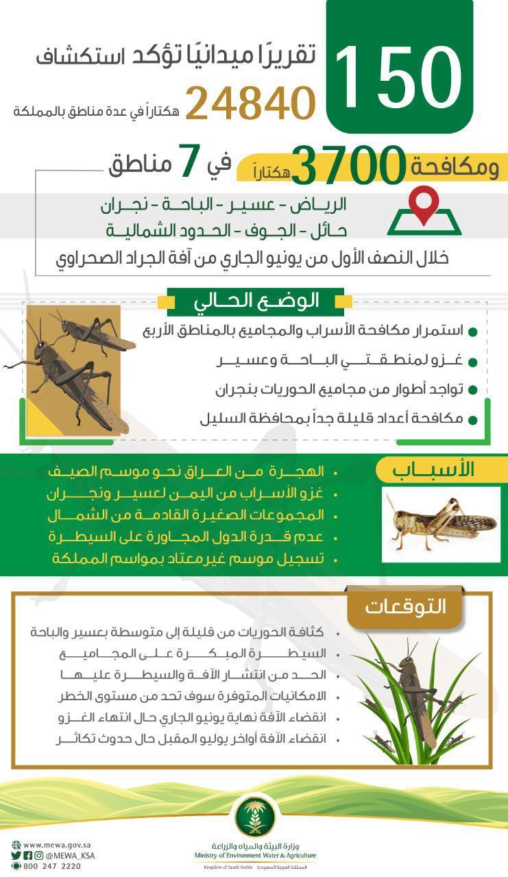 وأبانت أن هذه الإصابات ناجمة عن الوضع الراهن لحالة الجراد الصحراوي في الدول المجاورة وعدم قدرتهم في السيطرة الجيدة على الآفة مما سمح لحدوث موسم مستجد بالمملكة في نطاق غير مسجل ضمن مواسم التكاثر للجراد الصحراوي.